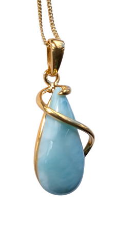 A teardrop shaped Larimar gemstone hand set in silver and 9ct gold plated . The pendant has a swirling design and comes complete with an 18 inch (45Cm) silver gold plated chain.