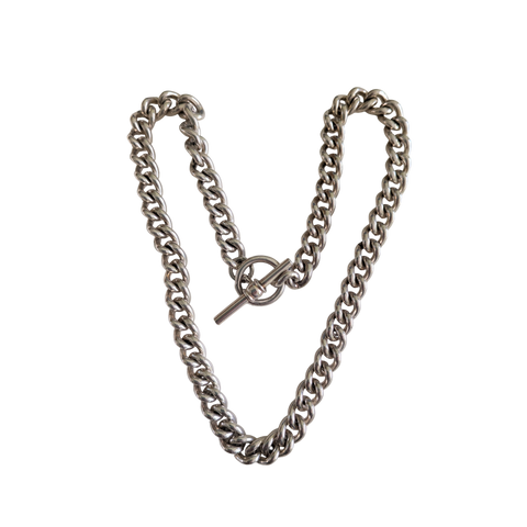 A heavy silver curb neck chain  with an unusual T-bar fastener.