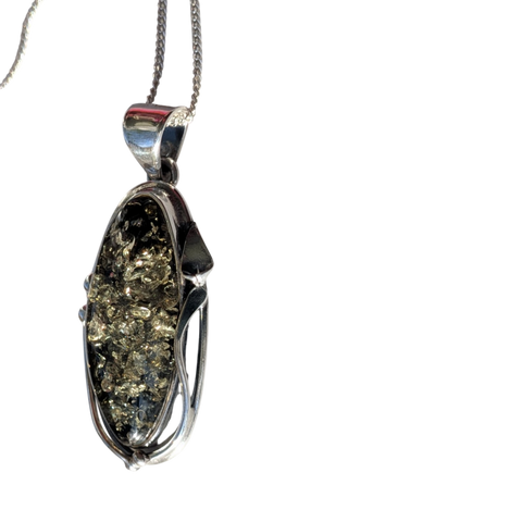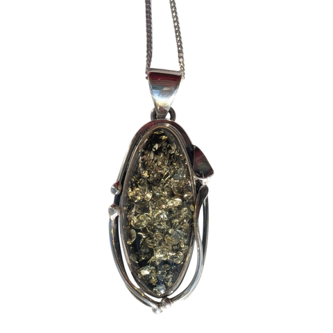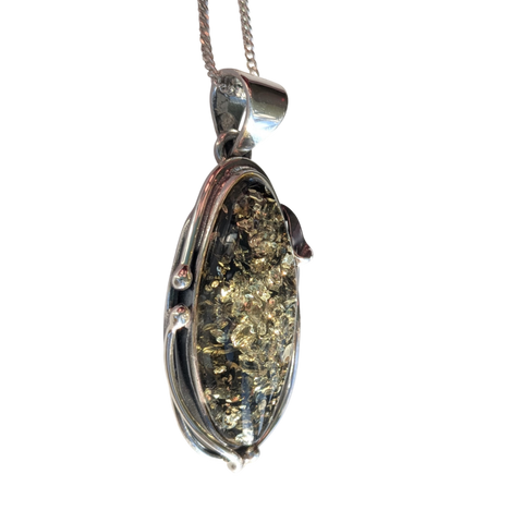 A twinkling green Amber gemstone hand set in silver . The pendant has Art Deco style designs on either size and comes complete with an 18 inch (45cm ) silver chain .